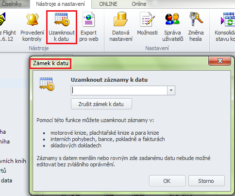 - uzamknout k datu - vyberte datum a záznamy staršího nebo stejného data jako zadané bude možné editovat jen se zvláštním povolením a vždy se zobrazí upozornění. Nižší úrovní tohoto zámku je "Pracovní zámek", který je možné uplatnit na označených záznamech po stisknutí pravého tlačítka myši. Po zamčení se objeví symbol zámku ve sloupci vlevo u příslušného záznamu. Stejným způsobem lze data odemknout. Data zamčená pracovním zámkem mohou bez upozorňování otevírat uživatelé s příslušným právem v nastavení, ostatním jsou nedostupná. Pokud nový/upravovaný záznam spadá do uzamčeného období, nelze jej uložit.
