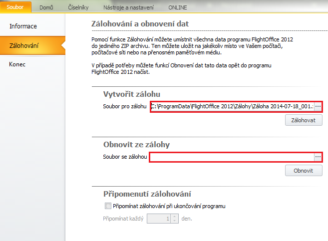 Pomocí této funkce se všechna data z programu Flight Office 2012 umístí do jednoho ZIP archivu. Ten je pak možné uložit kamkoli do Vašeho počítače, počítačové sítě nebo na přenosný paměťový disk. Pomocí funkce "Obnovení dat" lze pak data do programu přenést zpět. V sekci "Nástroje a nastavení - Správa uživatelům" lze některým uživatelům (pokud používáte funkci "Víceuživatelský přístup" povolit vytváření záloh nebo obnovování dat (tyto funkce jsou ve správě uživatelů zadané odděleně).