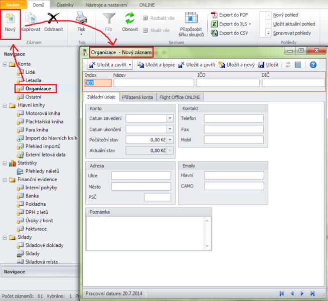 5. "Konta - Organizace" - do této evidence založte pod indexem, který si zvolíte, organizaci s názvem a údaji firmy, kterou jste zadali do místního nastavení. Toto konto bude základní protiúčet pro finanční pohyby realizované v programu, pokud se nerozhodnete založit další strukturu ostatních kont, která budou pro tyto účely sloužit. Více o kontech v nápovědě Konta.