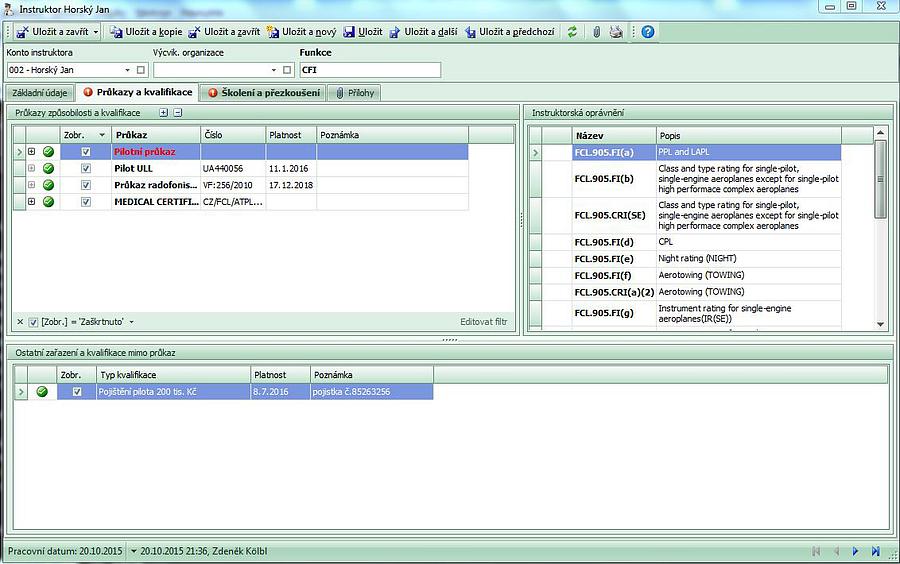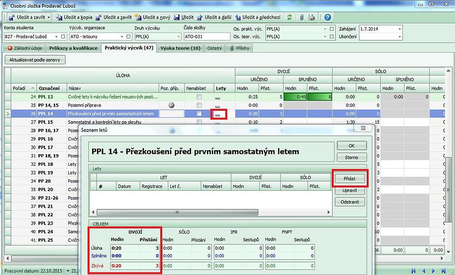 2. Jako první je proveden záznam do letové evidence. Při jeho zadávání se do osobní složky vytvoří záznam o letu k příslušné úloze a instruktor následně do osobní