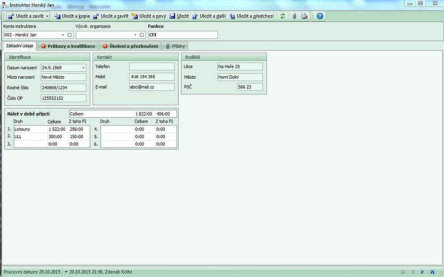 Pod tuto nabídku lze zadávat personál zabezpečující chod školy, tzn. instruktory letové i pozemní výuky a případně lektory teorie. Kartu založíme stisknutím ikony "Nový" a vložením - přenesením - údajů příslušné osoby jejím výběrem z "Konta - Lidé".