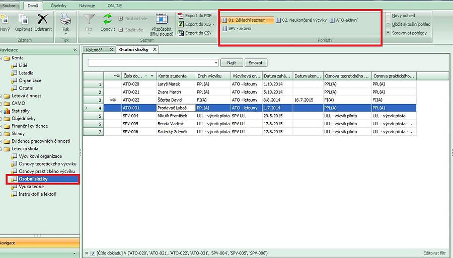 Pod nabídkou "Osobní složky" jsou uloženy výcvikové složky účastníků výcviku a to dohromady pro všechny evidované letecké školy. Složky pro konkrétní školu si může uživatel zobrazit velice rychle podle přednastavených filtrů - pohledů.
