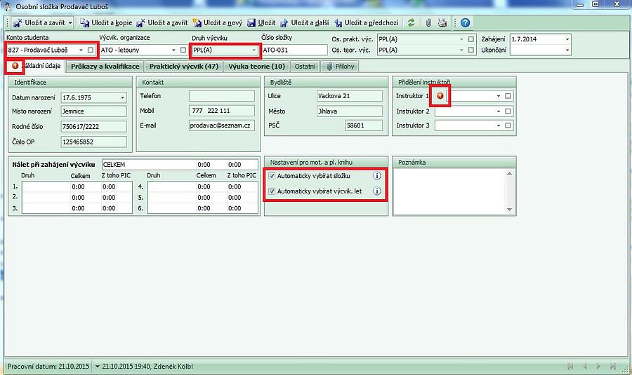Na osobní složce záložce "Základní údaje" je pole"automaticky vybírat výcvikový let" - pokud je zaškrtnuto, předvyplní se záznam zápisu do letové knihy po zadání studenta údaji prvního nepropojeného letu zadaného instruktorem do výcvikové dokumentace.