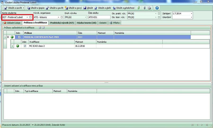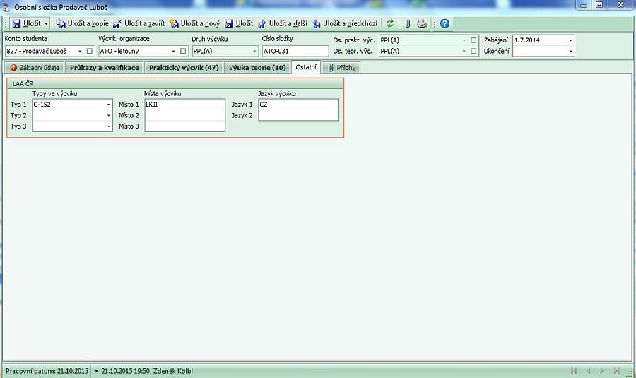 složky zvolíte výcvikovou organizaci a následně druh prováděného výcviku. Protože s touto částí se nejvíce pracuje, je záložka "Praktický výcvik" nabízena jako první po otevření osobní