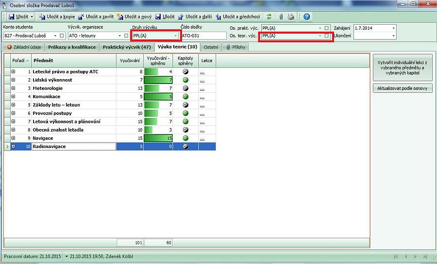 Sem se opět automaticky doplní osnova teoretické výuky v okamžiku, kdy v hlavičce osobní složky zvolíte výcvikovou organizaci a následně druh prováděného výcviku.