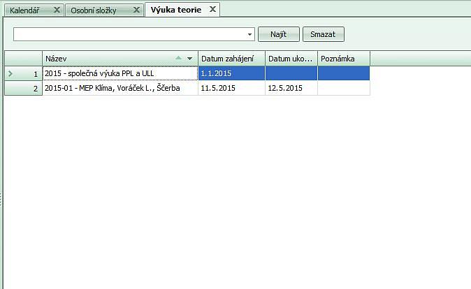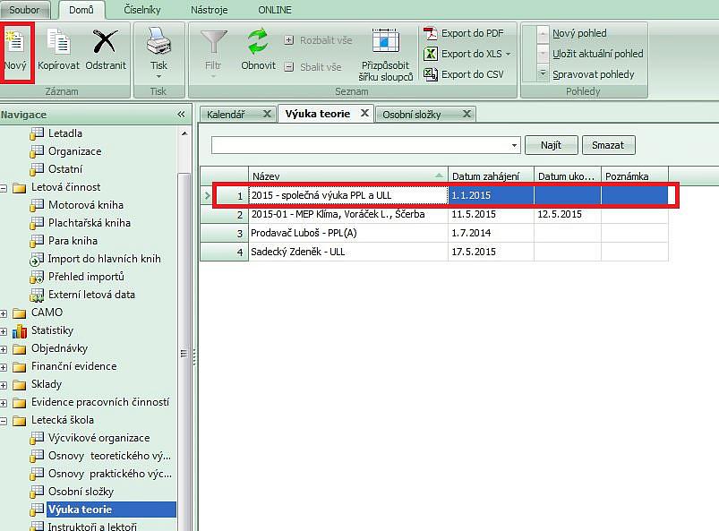 - v nabídce "Výuka teorie" založíme nový kurz, např. "2015 - společná výuka PPL a ULL".
