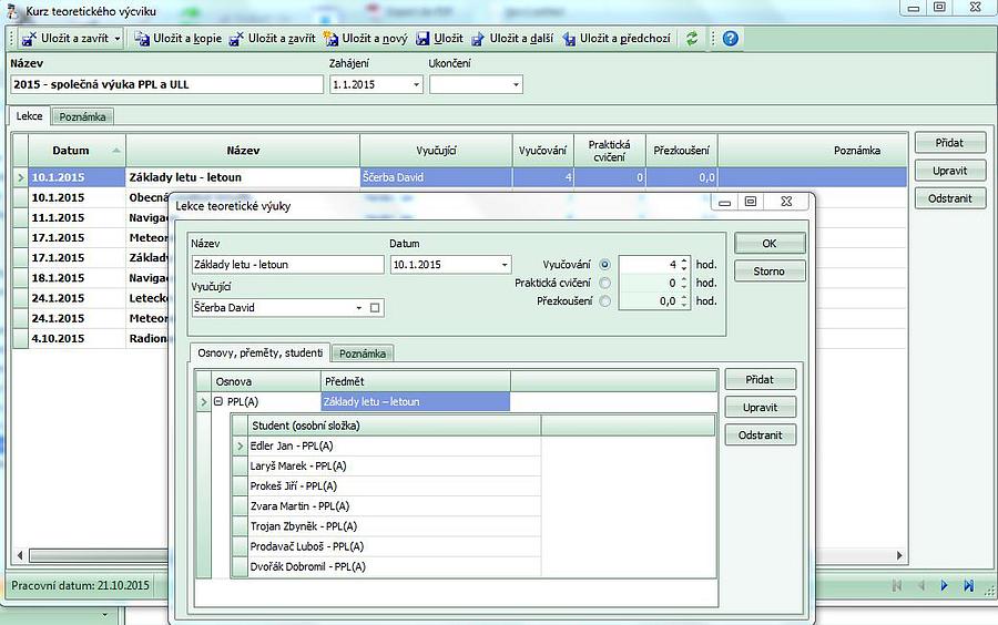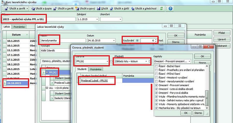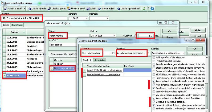 - lektor si v kurzu založí a připraví lekci např. "Aerodynamika" na 24.10.2015 a protože předpokládá, že se dostaví studenti z výcviku PPL a ULL, přidá do lekce
