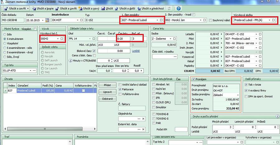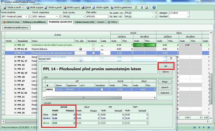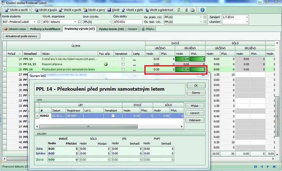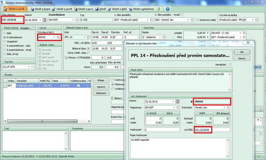 - při uložení letu do knihy se otevře záznam z výcvikové složky, proběhne kontrola a potvrzením záznamu se vše uloží. Na záznamu letu ve výcvikové složce je číslo