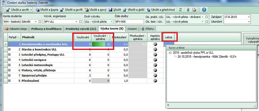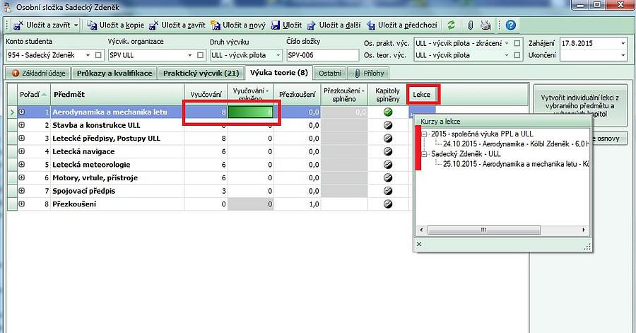 - po uložení záznamu lekce se do osobních složek zúčastněných zapíše účast, předmět a rozsah (splněné kapitoly) absolvované výuky. Ve sloupci "Lekce" lze po stisknutí ... zjistit, jaké lekce výuky student absolvoval.