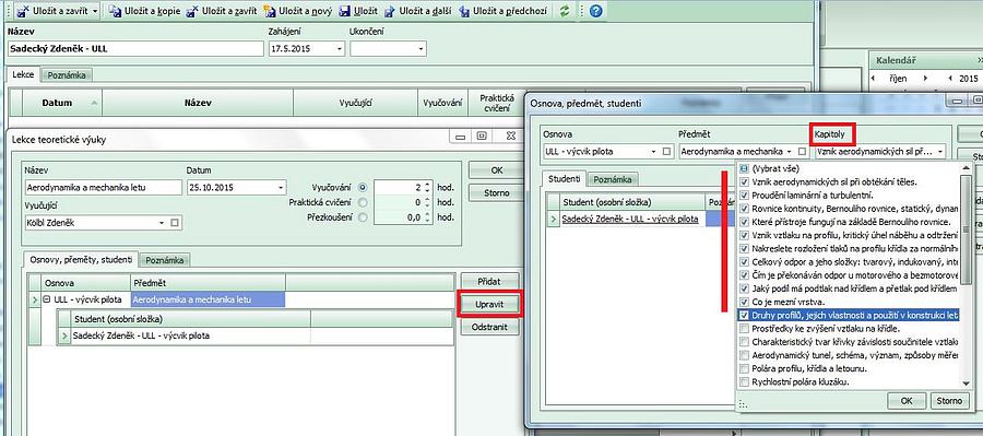 - v záložce "Osnovy..."stiskněte "Upravit" a vyplňte, jaká části výuky - kapitoly - budou předmětem lekce. Program nabízí zaškrtnuté ty kapitoly, které nemá student splněné.