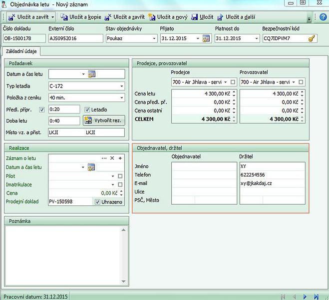 - Datum a čas letu - nemusí být (např.při prodeji poukazu s dobou platnosti) vyplněno. Pokud je vyplněn datum, zobrazí se objednávka v kalendáři. Pokud není vyplněn čas letu, je objednávka v kalendáři zobrazena v horní části příslušného dne v oblasti pro vícedenní akce, pokud je čas letu vyplněn, zobrazí se objednávka v nastaveném čase.