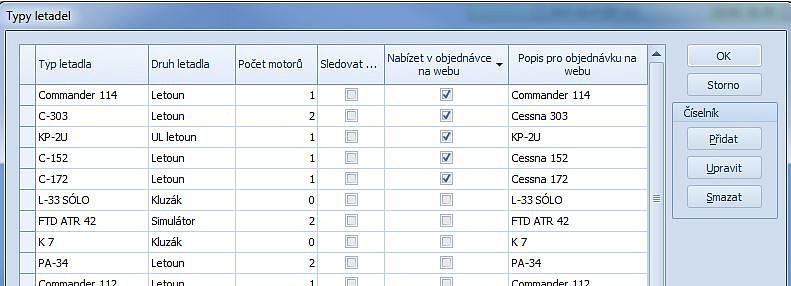 Doplnění nastavení typů letadel pro objednávky: