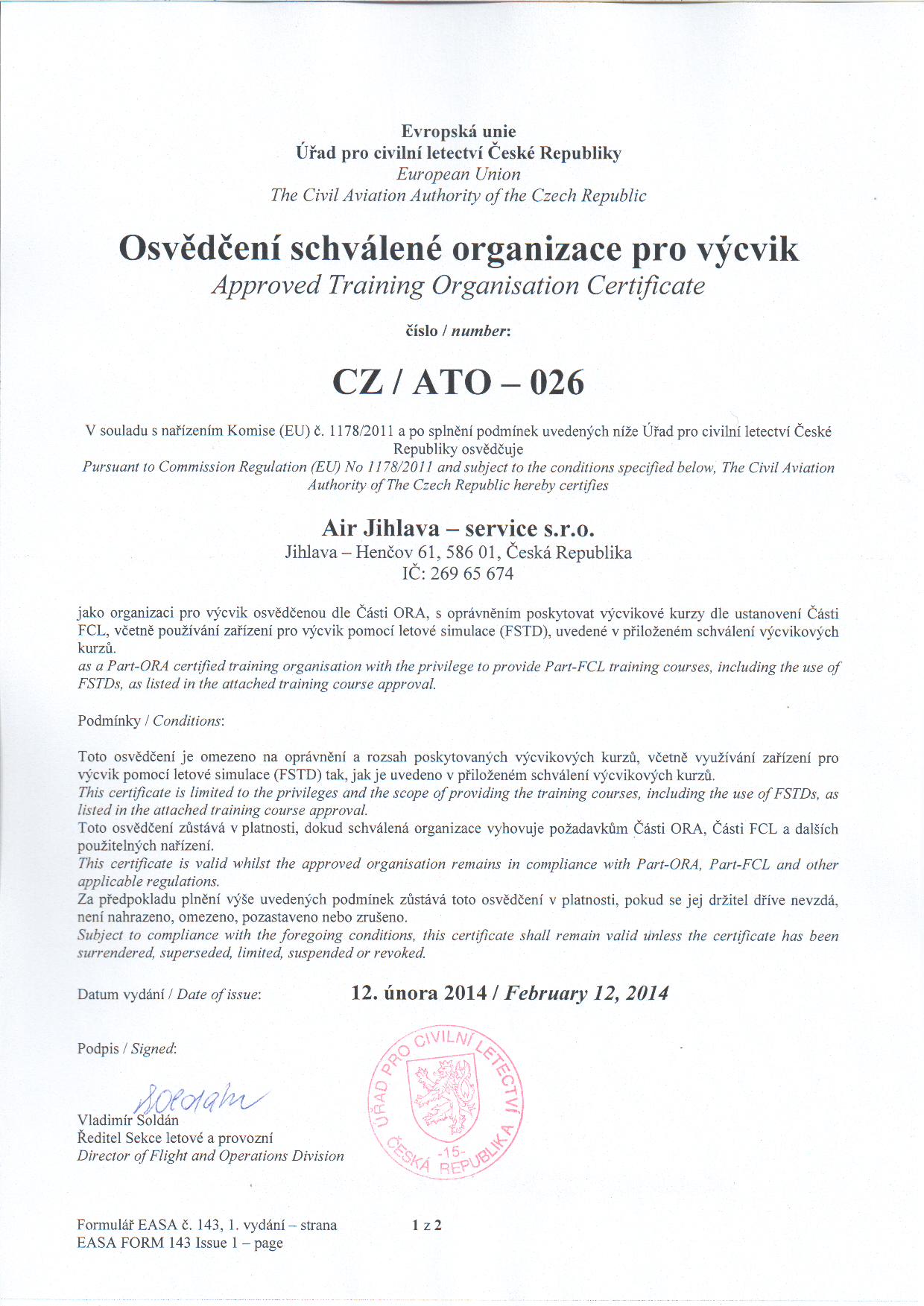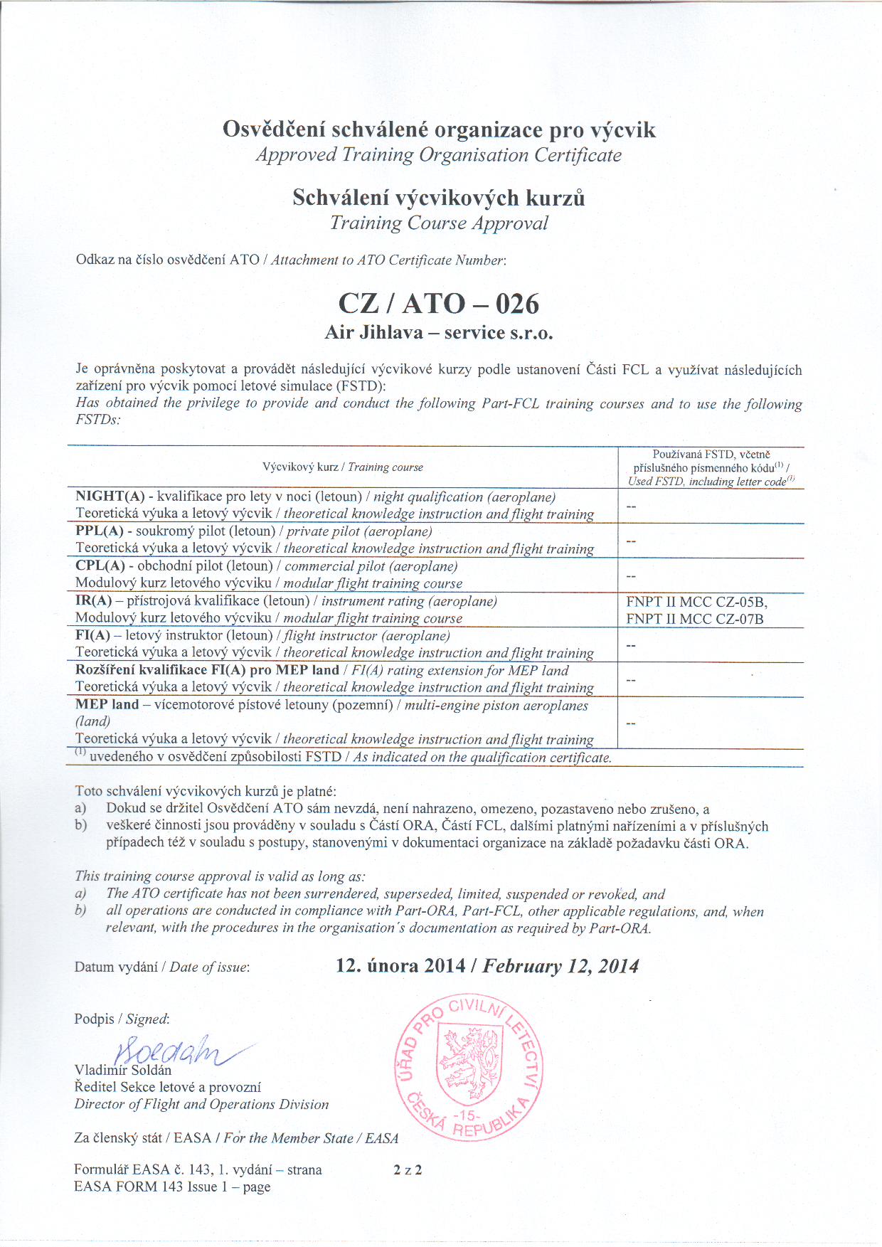 Letecká škola Air Jihlava - service s.r.o. zahájila činnost v roce 2008 jako registrované zařízení pro výuku PPL(A) dle dodatku 3 k JAR-FCL 1.125 s evidenčním číslem 136 v registru Úřadu pro civilní letectví. Svým personálním obsazením navazuje na dlouhodobou tradici a zkušenosti zabezpečujícího personálu. V lednu 2012 jsme získali oprávnění výcvikové organizace pod registračním číslem CZ/FTO(A)-026 a počátkem roku 2014 byla naše letecká škola certifikována podle nových evropských předpisů PART-FCL a získala oprávnění schválené výcvikové organizace